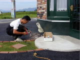 床や基礎にペンキを塗る。駐車場は先に自分たちでレンガを並べたり、芝生をはった後、アスファルトを業者さんに依頼しました。写真は玄関ポーチに貼るレンガをグラインダーでカットしているところです。作業途中、小雨が降ってきたのですが、子供たちもレンガを運んだり、たくさんお手伝いしてくれました。 |
