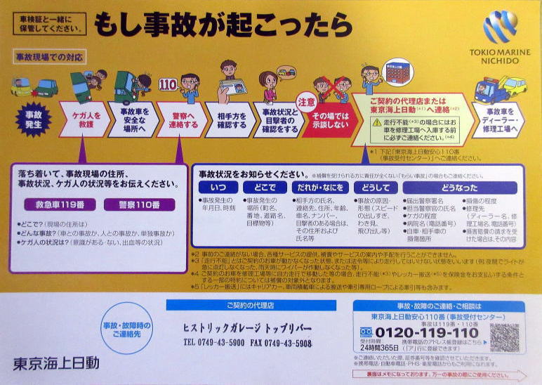 | 救急車 119 警察 110 東京海上日動安心110番 0120-119-110 (受付時間24時間365日) ヒストリックガレージトップリバー 0749-43-5900 |