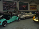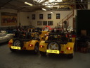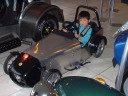 現在スーパー7を生産しているケーターハム社を訪問。1957年からSUPERSEVENはロータス社で生産されていたが、1973年に生産が打ち切られることになり、それを引き継いだのがロータス社の下請け工場だったケーターハム社。こちらの工場では日本向けの80%を生産。キットカーとしても販売している。イギリスは日が長いので個人がキットカーを購入し、自宅のガレージで自分のクルマをつくる人もいる。残念ながら日本では車の形になったものでないと登録が出来ない。実際イギリスの町で日常の足としてSEVENを走らせている人は少ない。ほとんどセカンドカーとして所有している。所有できない人の為かイギリスのケーターハム社にはセブンのレンタカーがあった。また、ケーターハム社ショールームには、子供用のミニチュアのセブンがありました。ハンドメイドのアルミパネルでフロントにはディスクブレーキが取り付けられていました。残念ながら販売予定はないそうです。 |